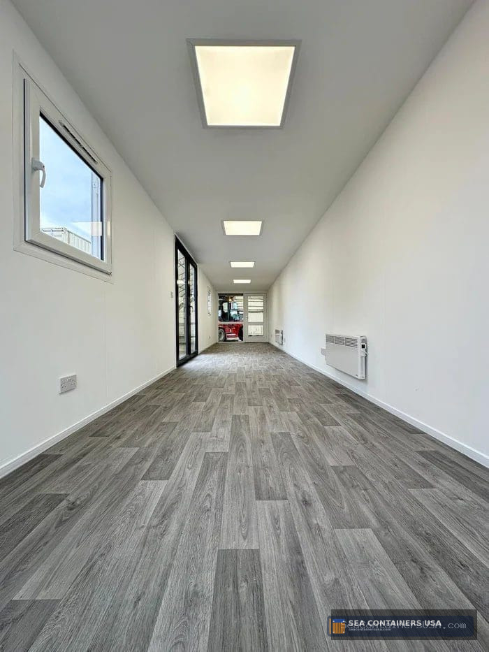 This shipping container has been converted into a fantastic & completely open plan office space! It has spray foam insulation to the walls ceilings & floors, new vinyl flooring & new electrics throughout!