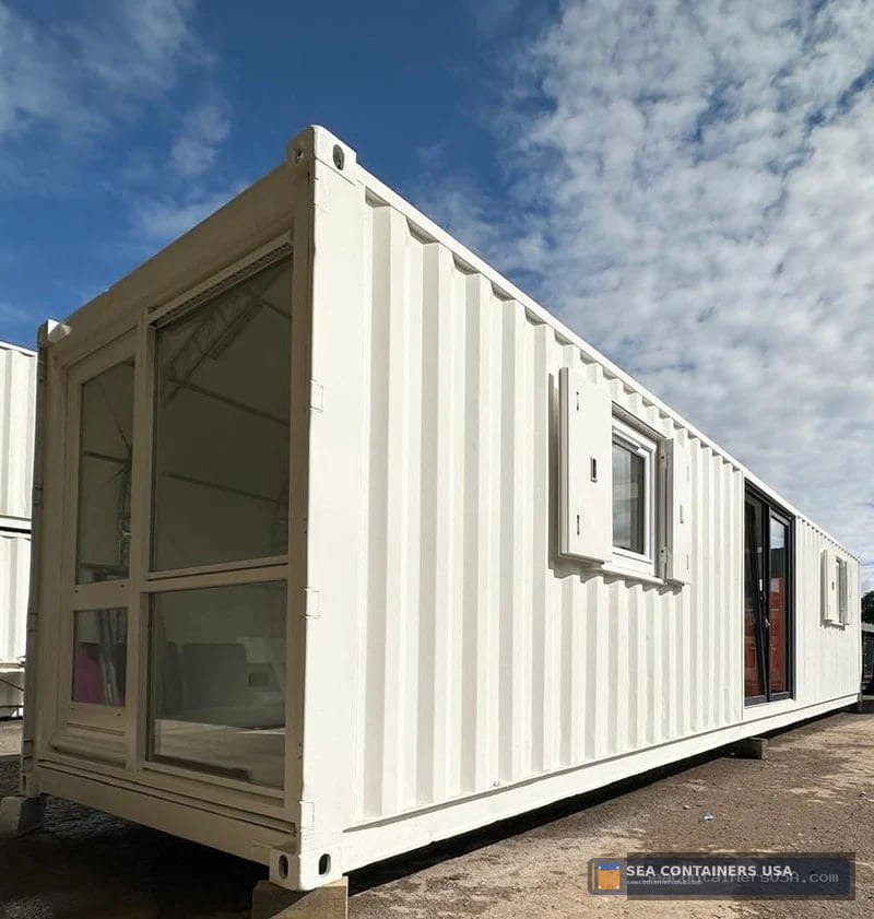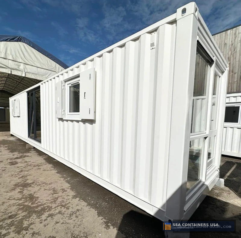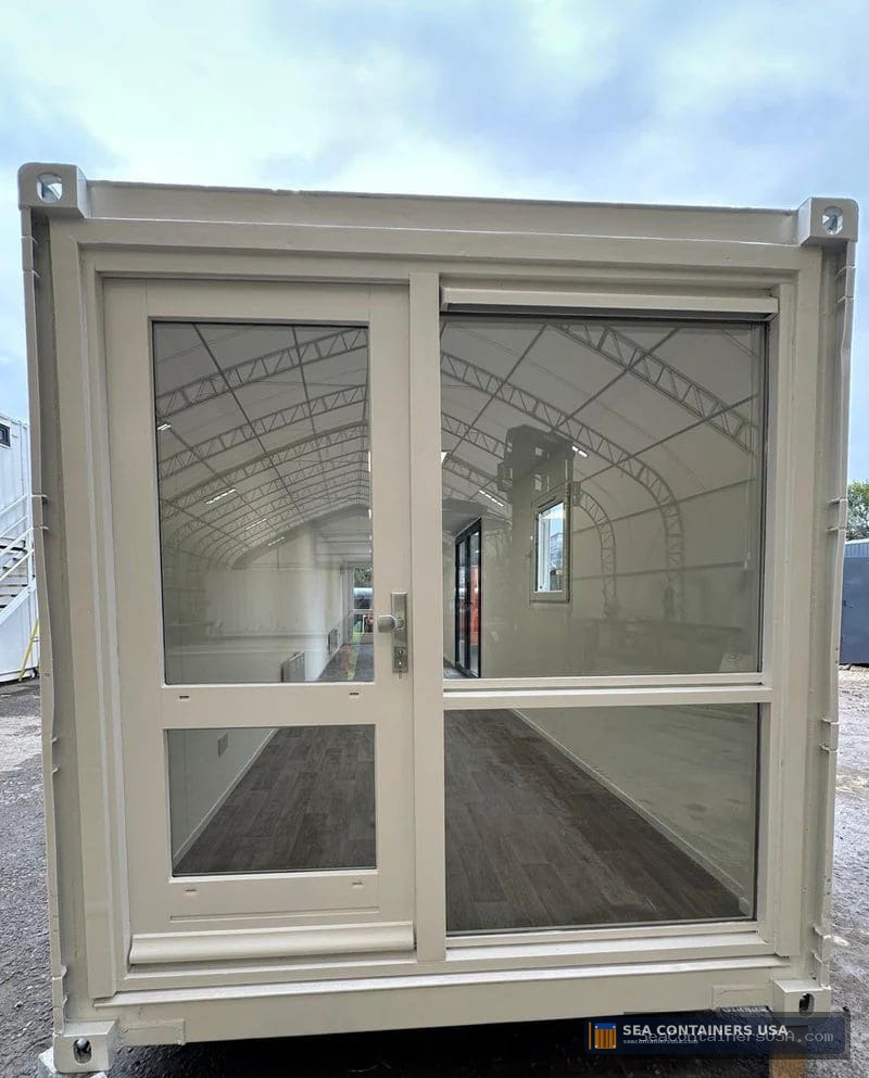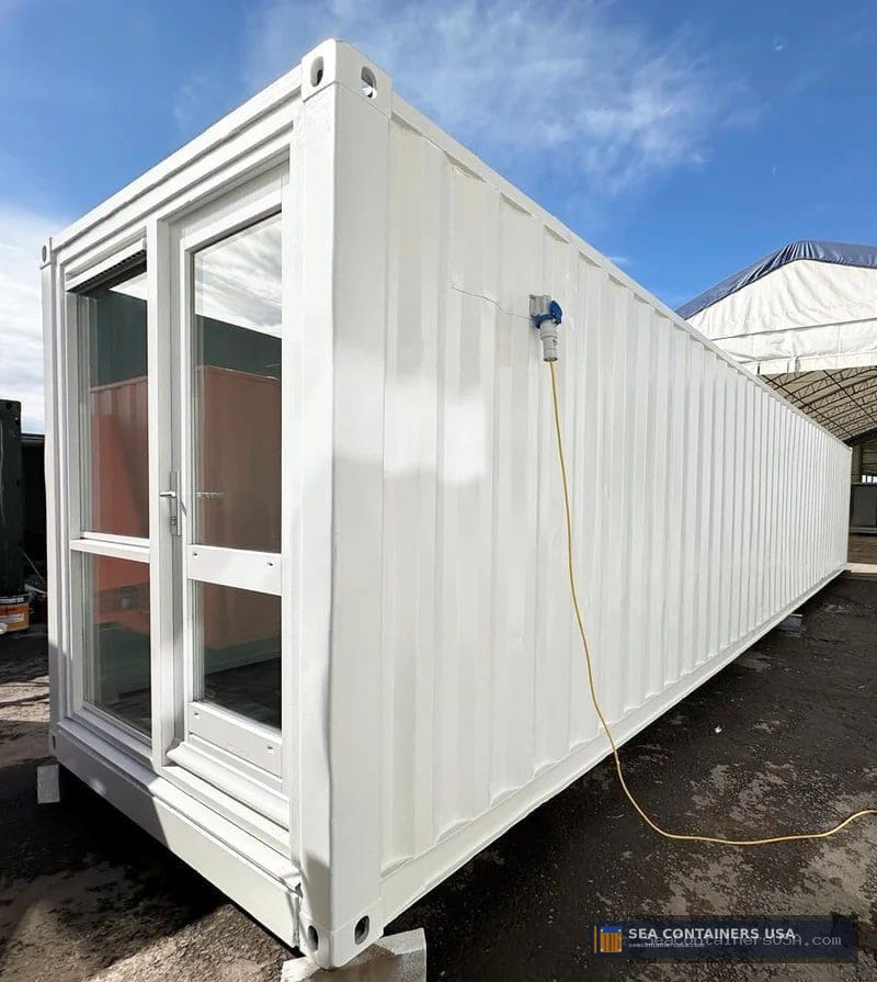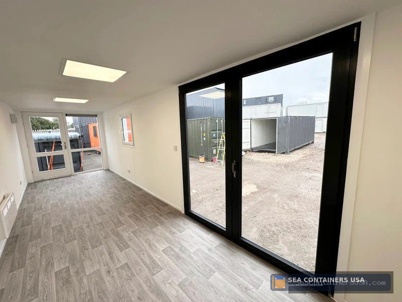 It has been fully plastered & finished in a matt white, with full glazing to each end panel; this container conversion is a real head-turner & it would certainly make a stunning portable working space!